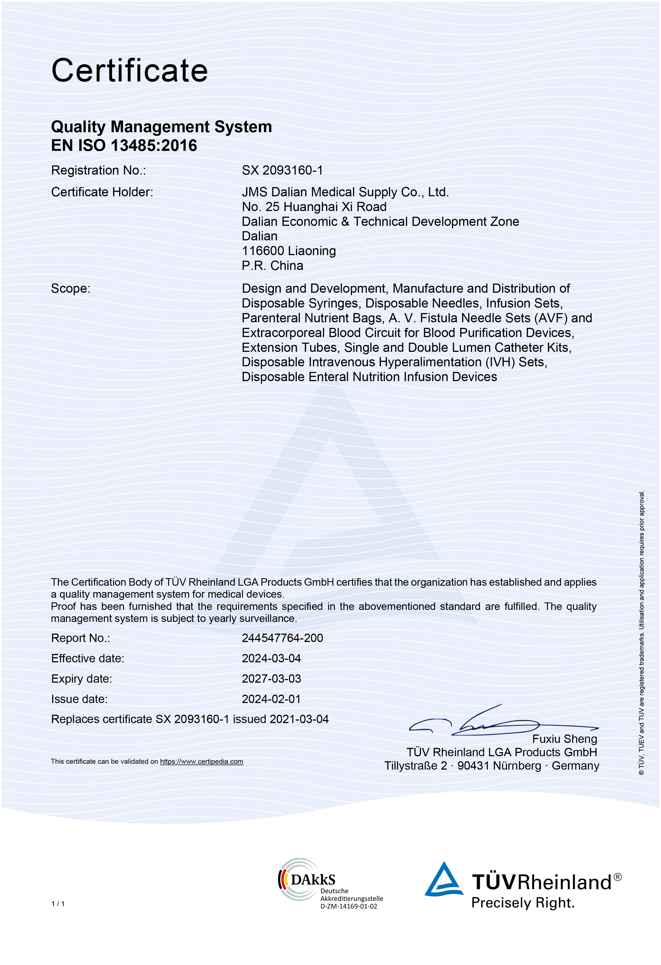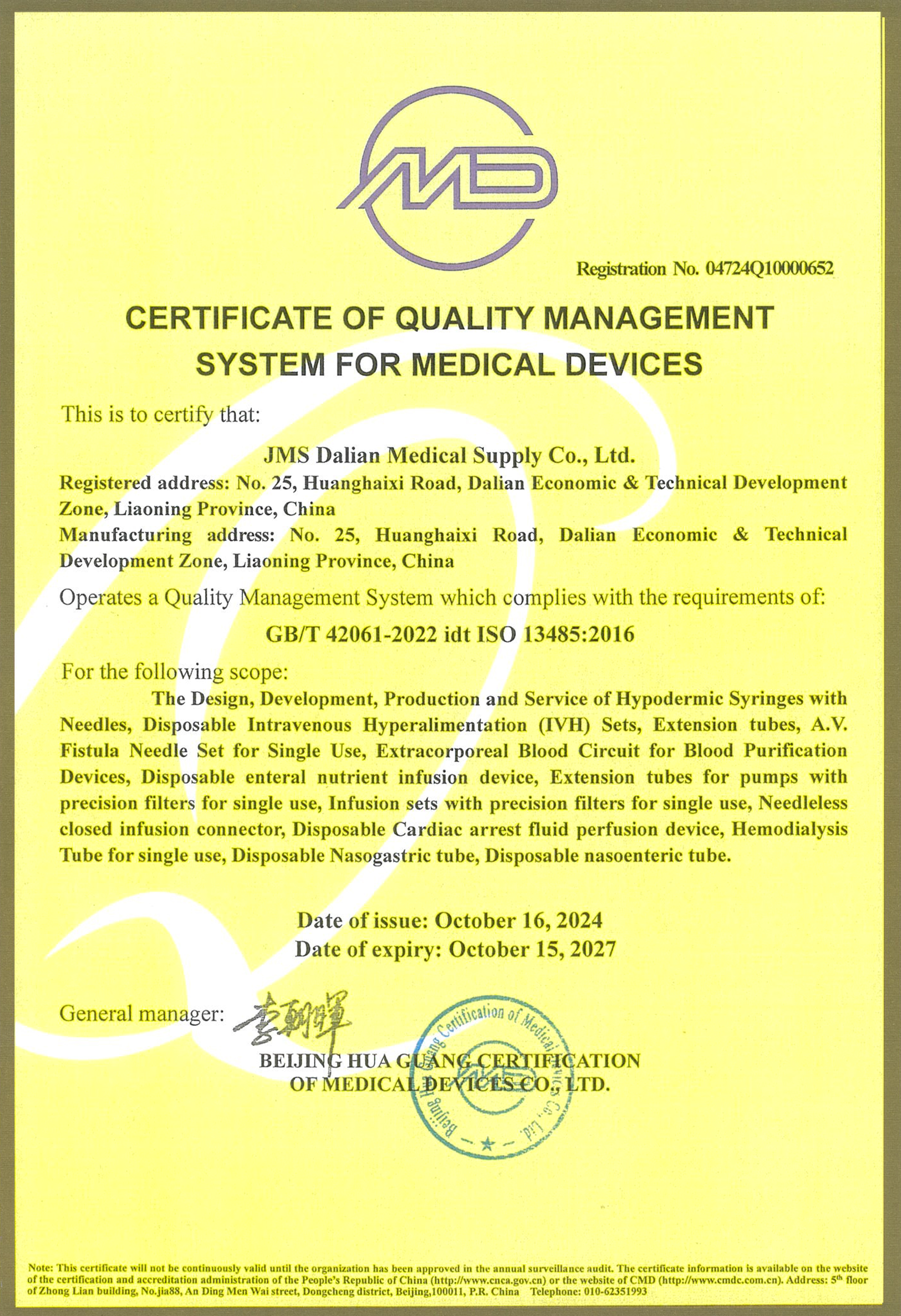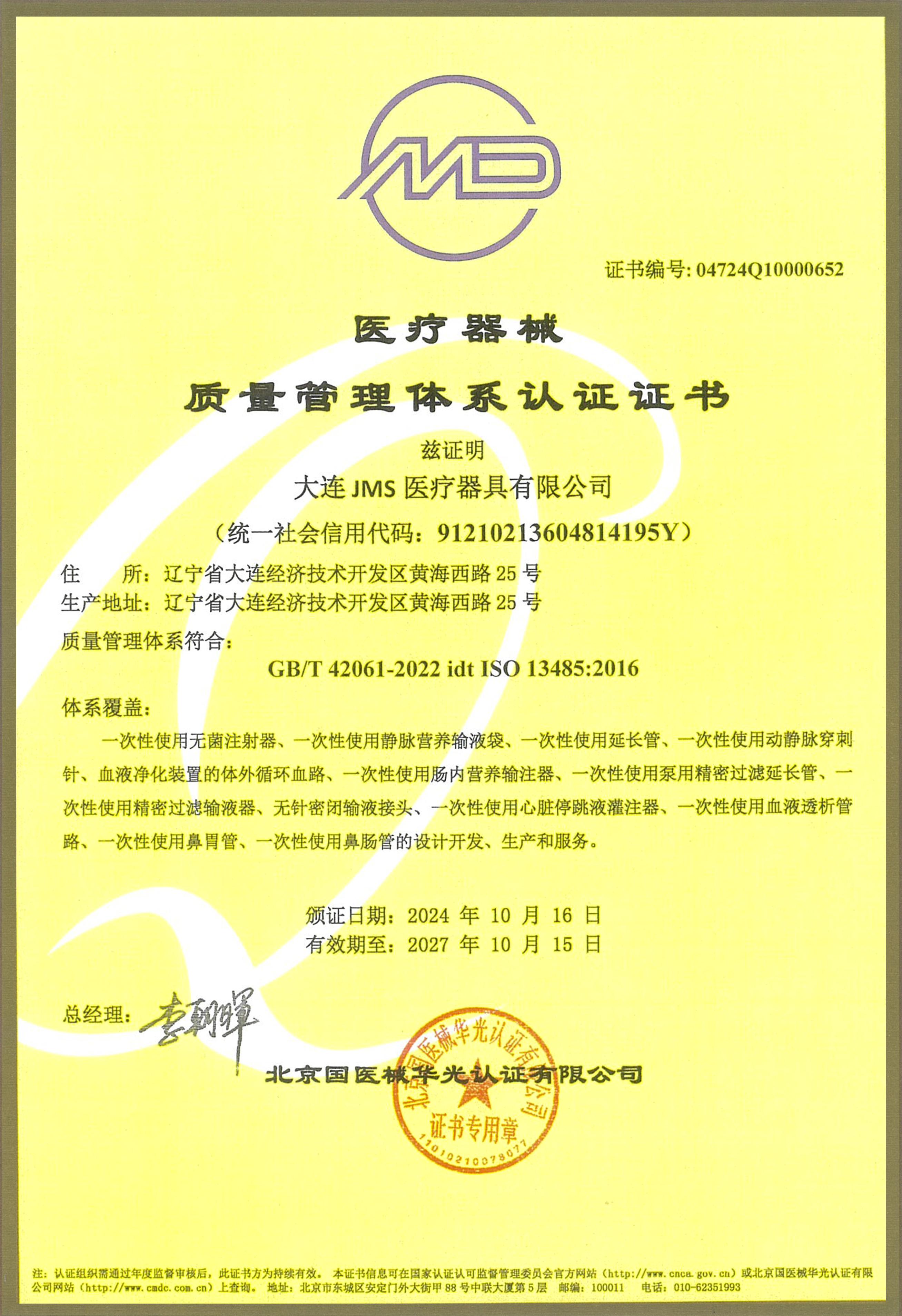 大連JMS醫(yī)療器具有限公司通過了ISO13485質(zhì)量體系認證。